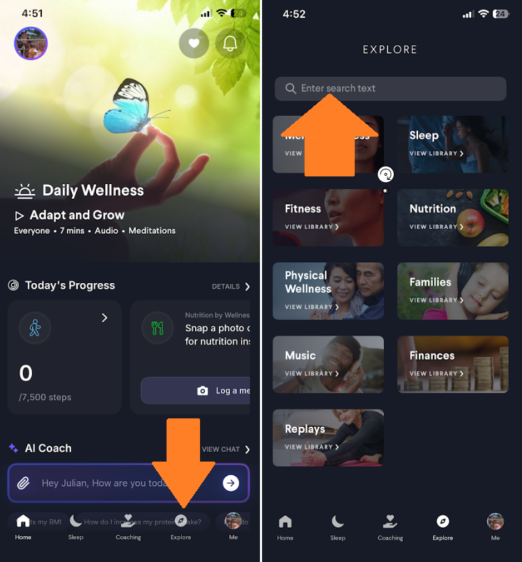 1. Navigate to the Explore tab located at the bottom of the mobile app interface