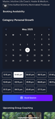 4. Once you decide which coach you would like to meet, you can book your session directly with the calendar below their profile. Find a date and time that works best for you.