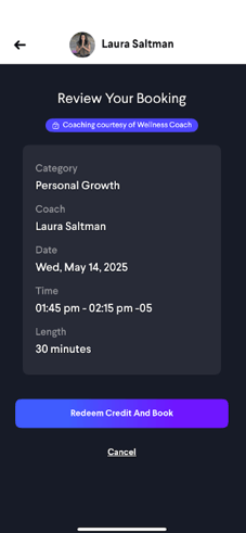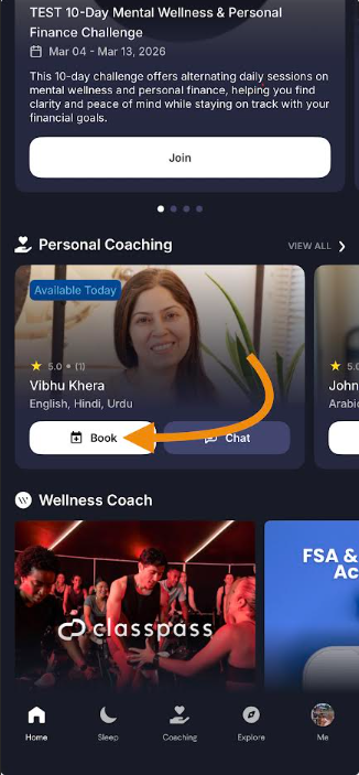 - Click on the Personal Coaching section on the home page of the Wellness Coach app. You can also click the Coaching tab at the bottom of the home screen in the Wellness Coach mobile app. You will be taken to the Discover section within Personal Coaching. This is the best way to find a new coach you have yet to meet with before or to book your first session.