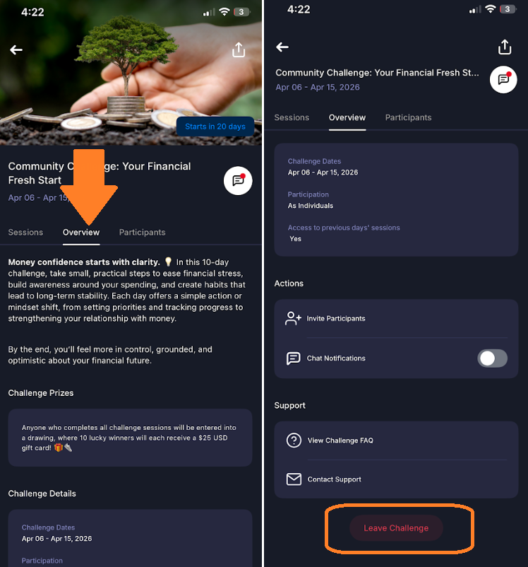 - Open the Challenge you wish to leave and navigate to Overview.