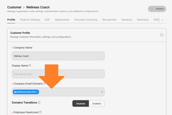 This article guides admins on how to add additional company email domains to their account. Adding domains ensures that employees using those email addresses can successfully register and access their company-sponsored Wellness Coach benefits.
